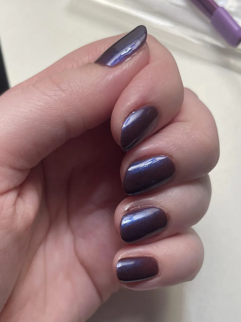 A purple sheer polish with an intense blue iridescent shimmer finish.