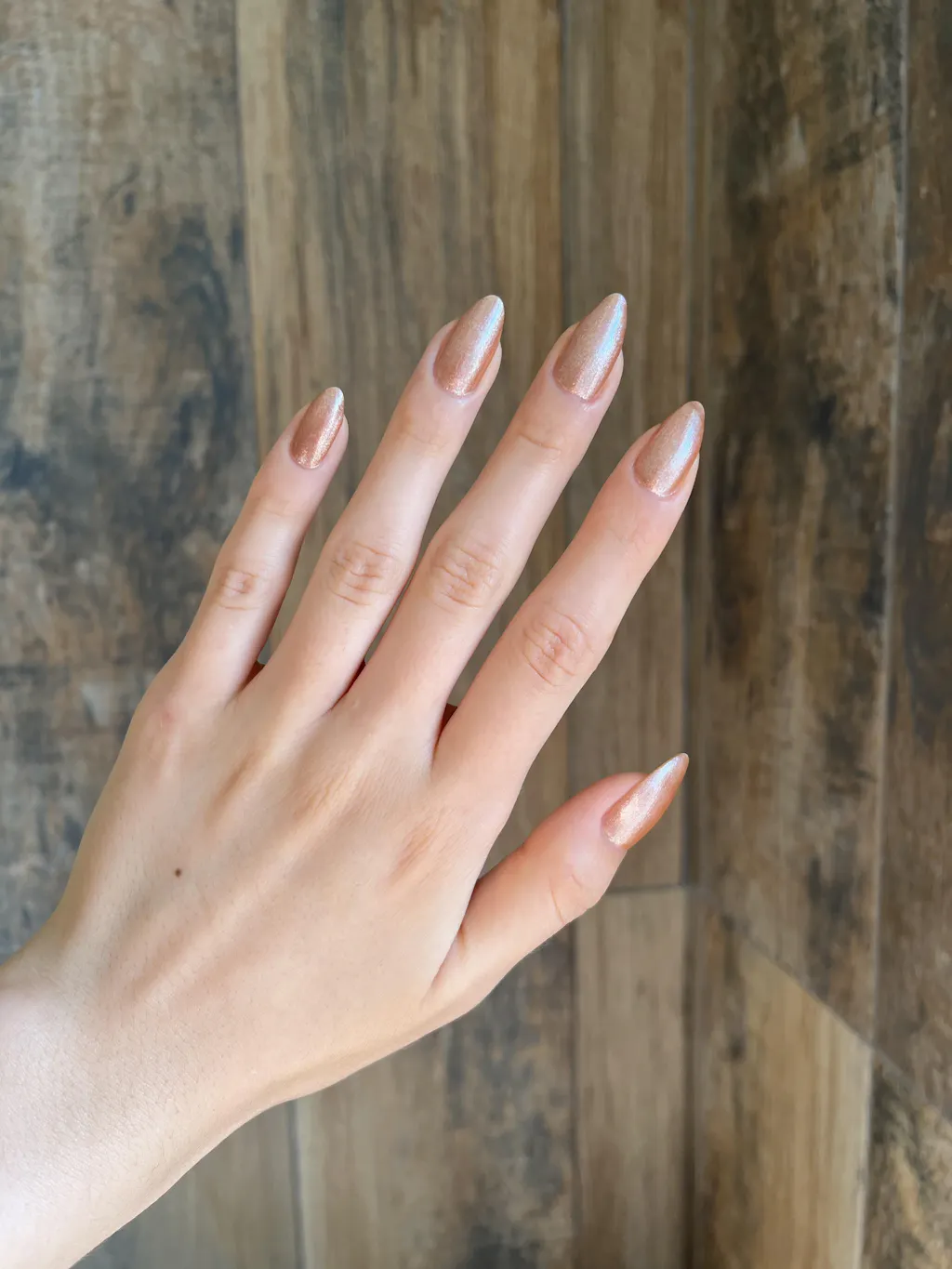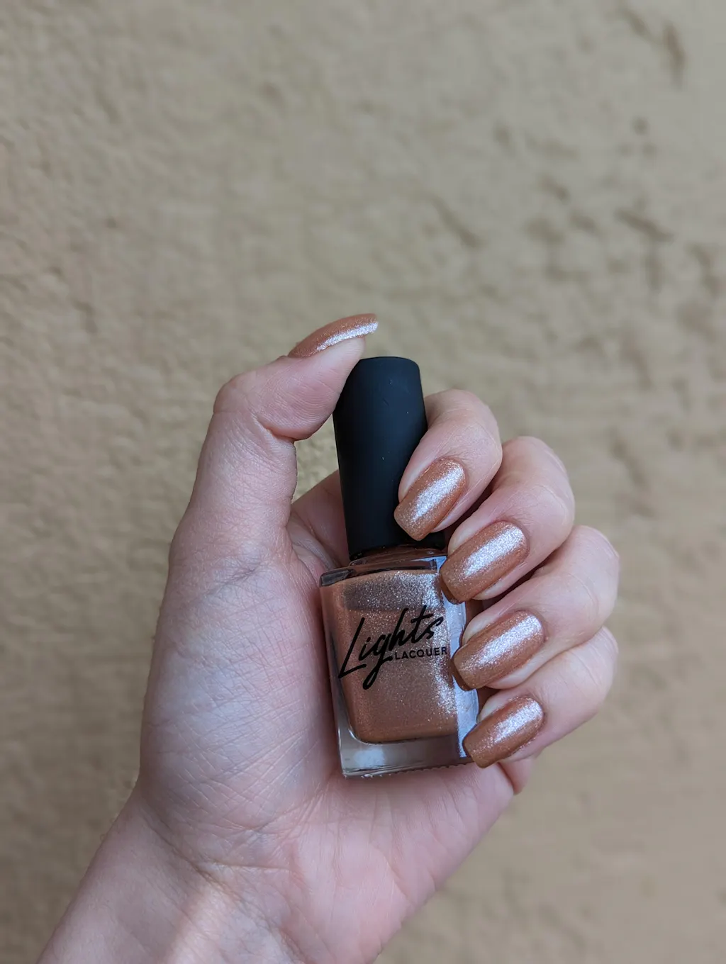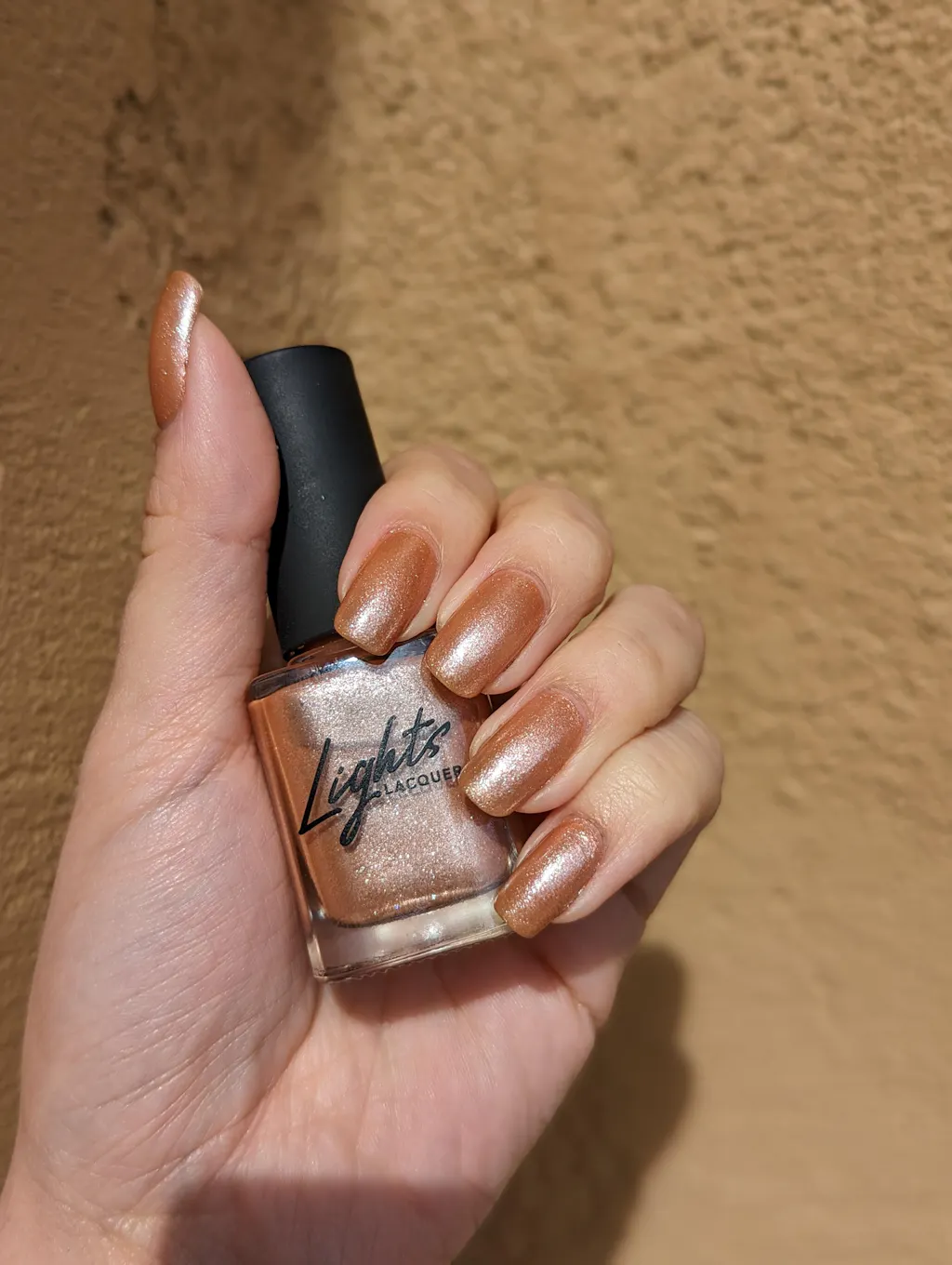 A Soft bronze peach polish with silver micro shimmer and a shimmer finish