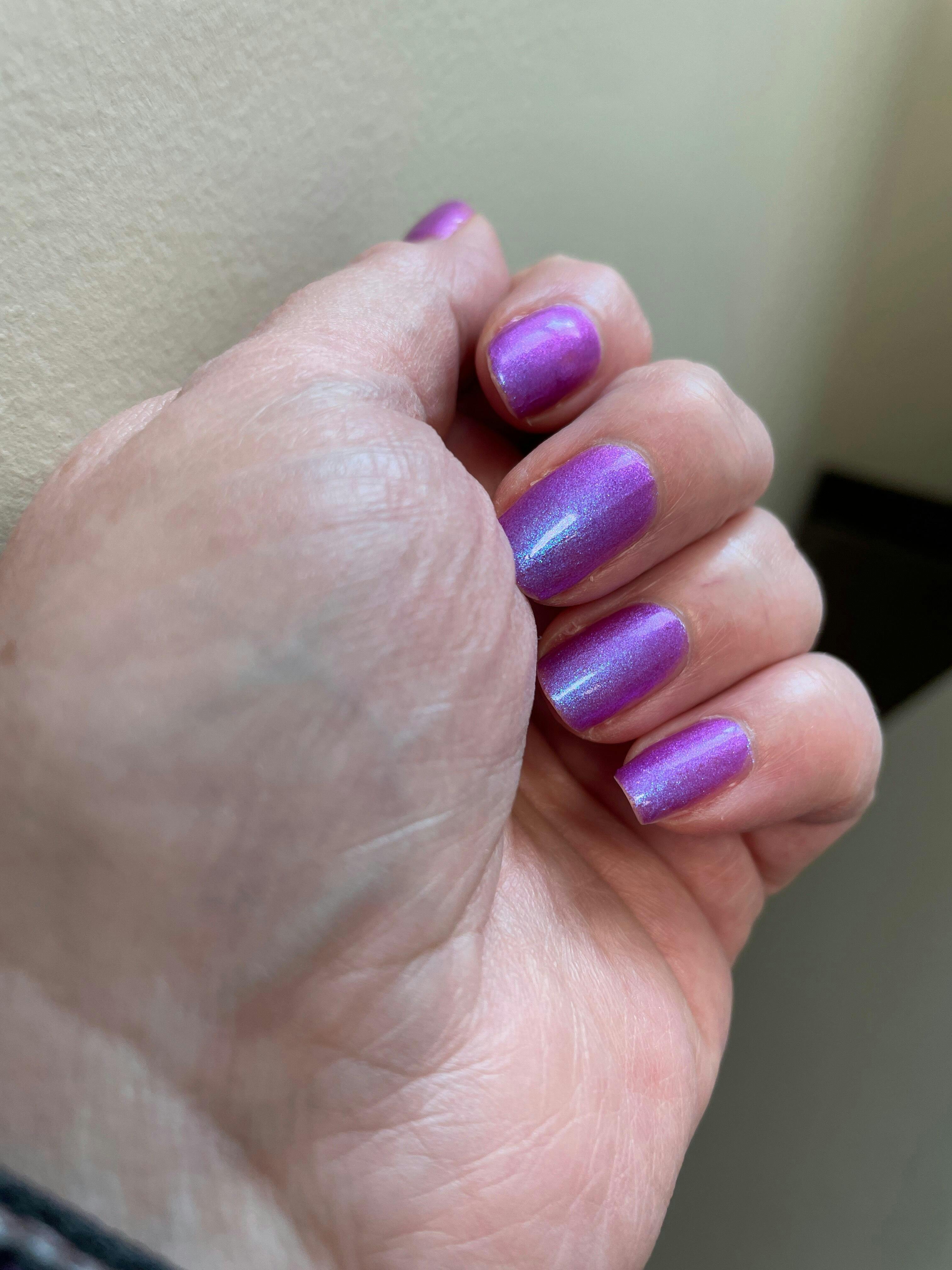 An orchid purple polish with a fine blue shimmer finish that dries matte.