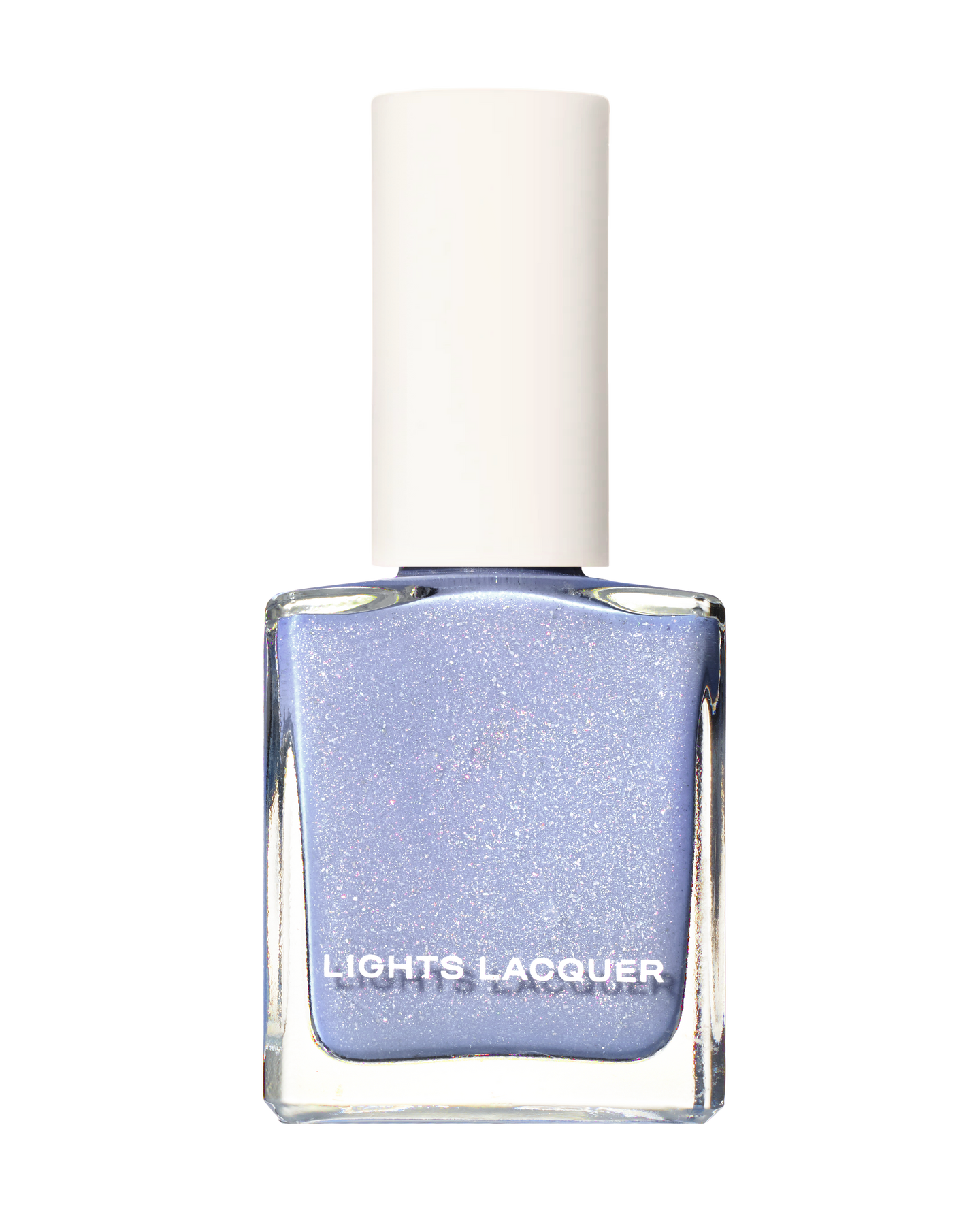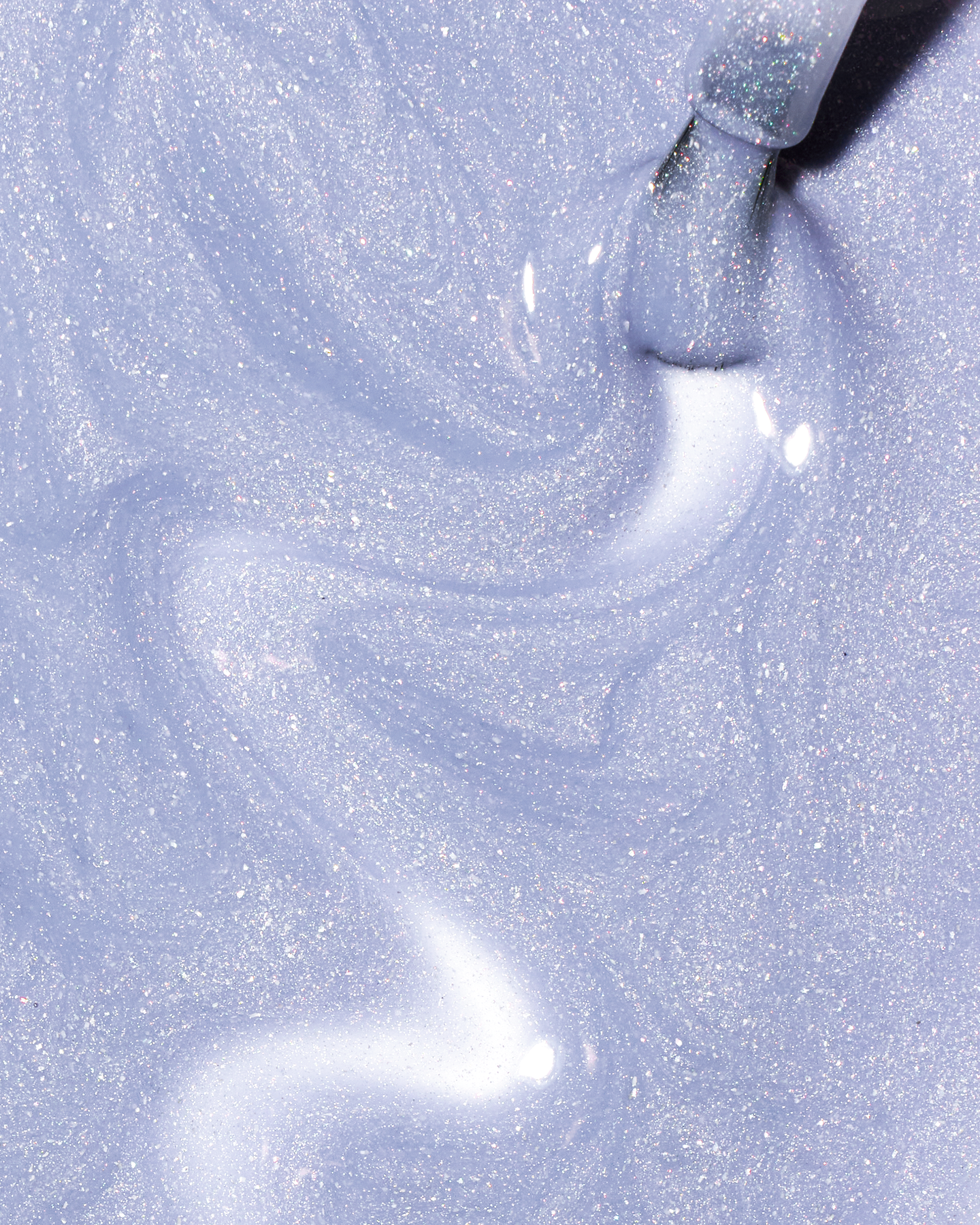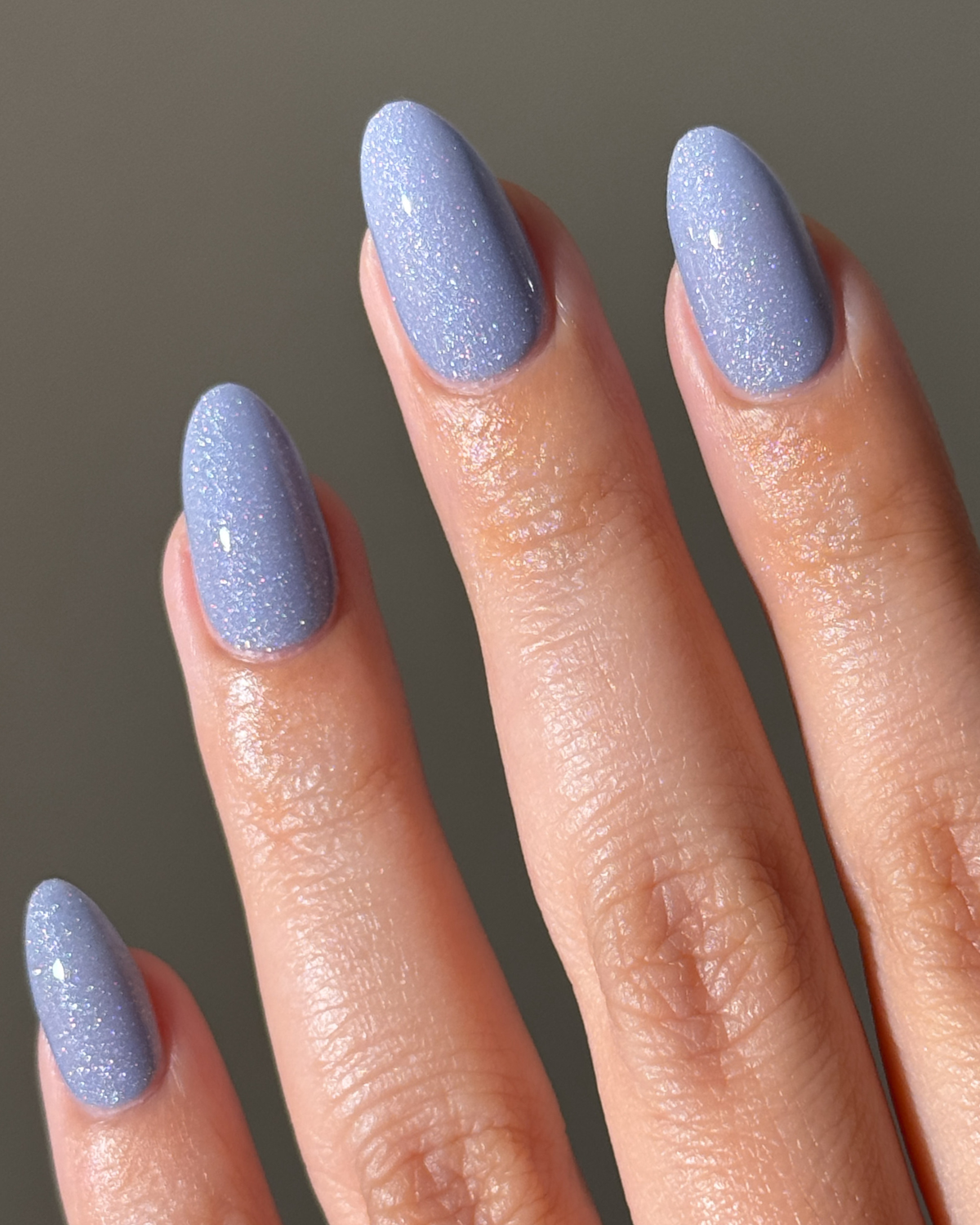A dusty periwinkle blue nail polish with a fine diamond shimmer finish.