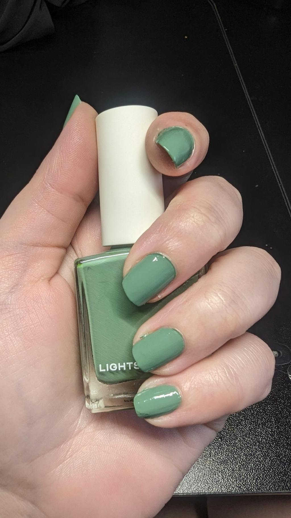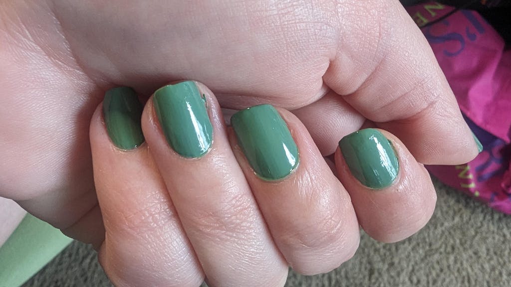 A dusty sage-green nail polish with a creme finish.