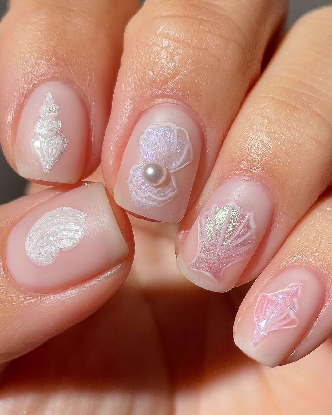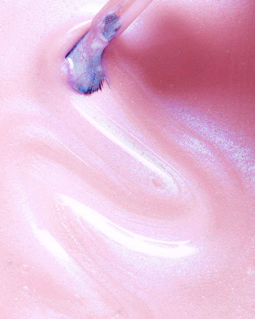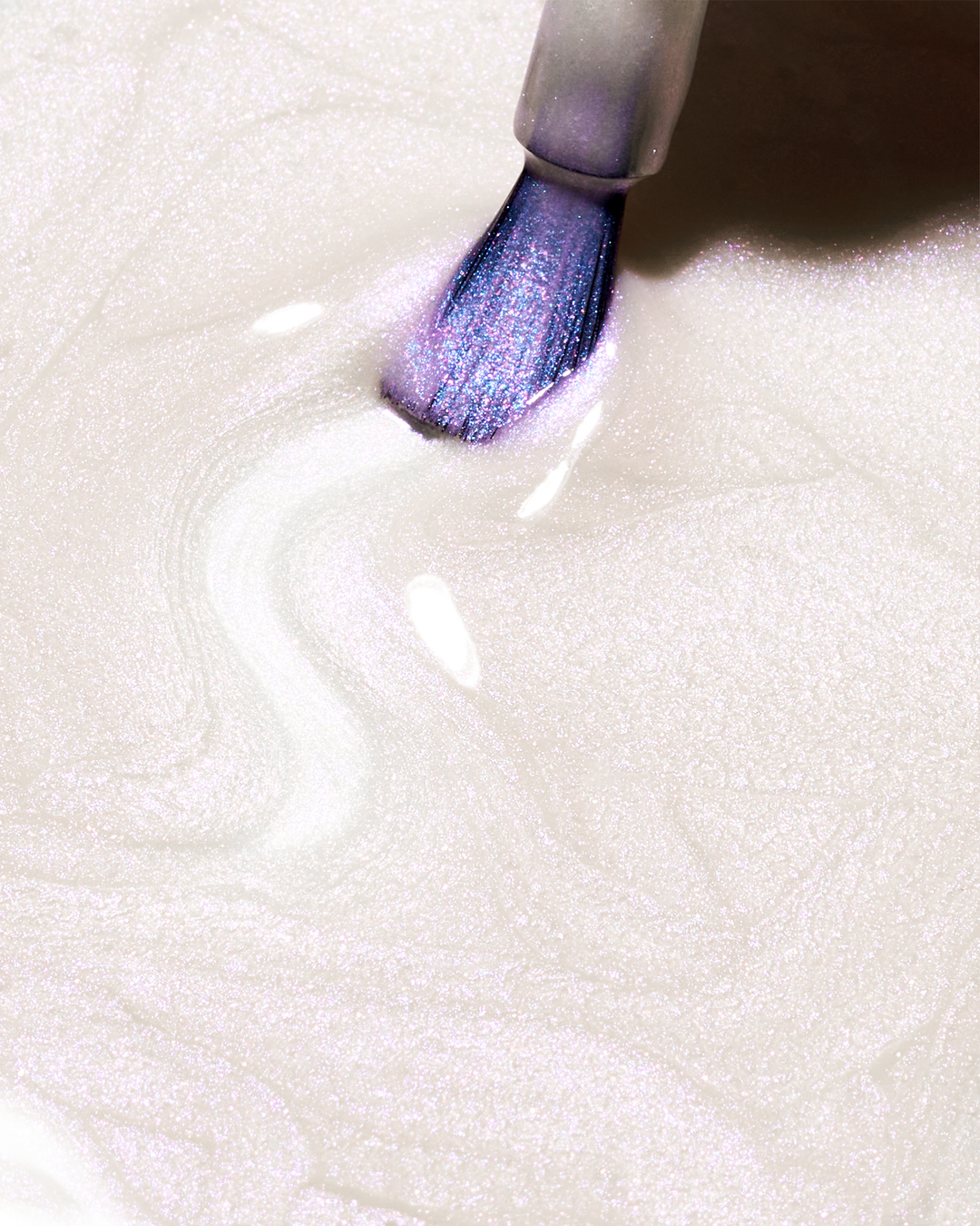 A soft off-white polish with a fine pink and blue shimmer finish.