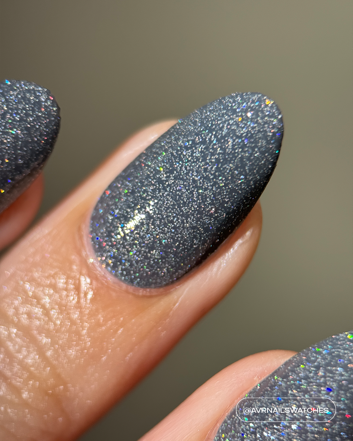 A deep grey-blue nail polish with holographic glitter and fine gold shimmer with a crelly finish.