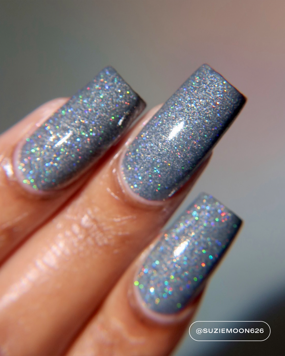 Color On: Apply 2–3 thin coats for full, even coverage—this holographic glitter polish offers a perfect balance of shimmer and depth, with a crelly base.