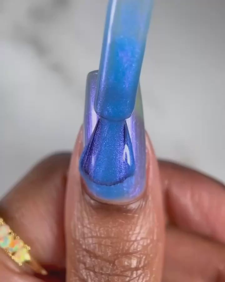 A sheer deep cornflower polish with a purple shift and a fine shimmer finish.