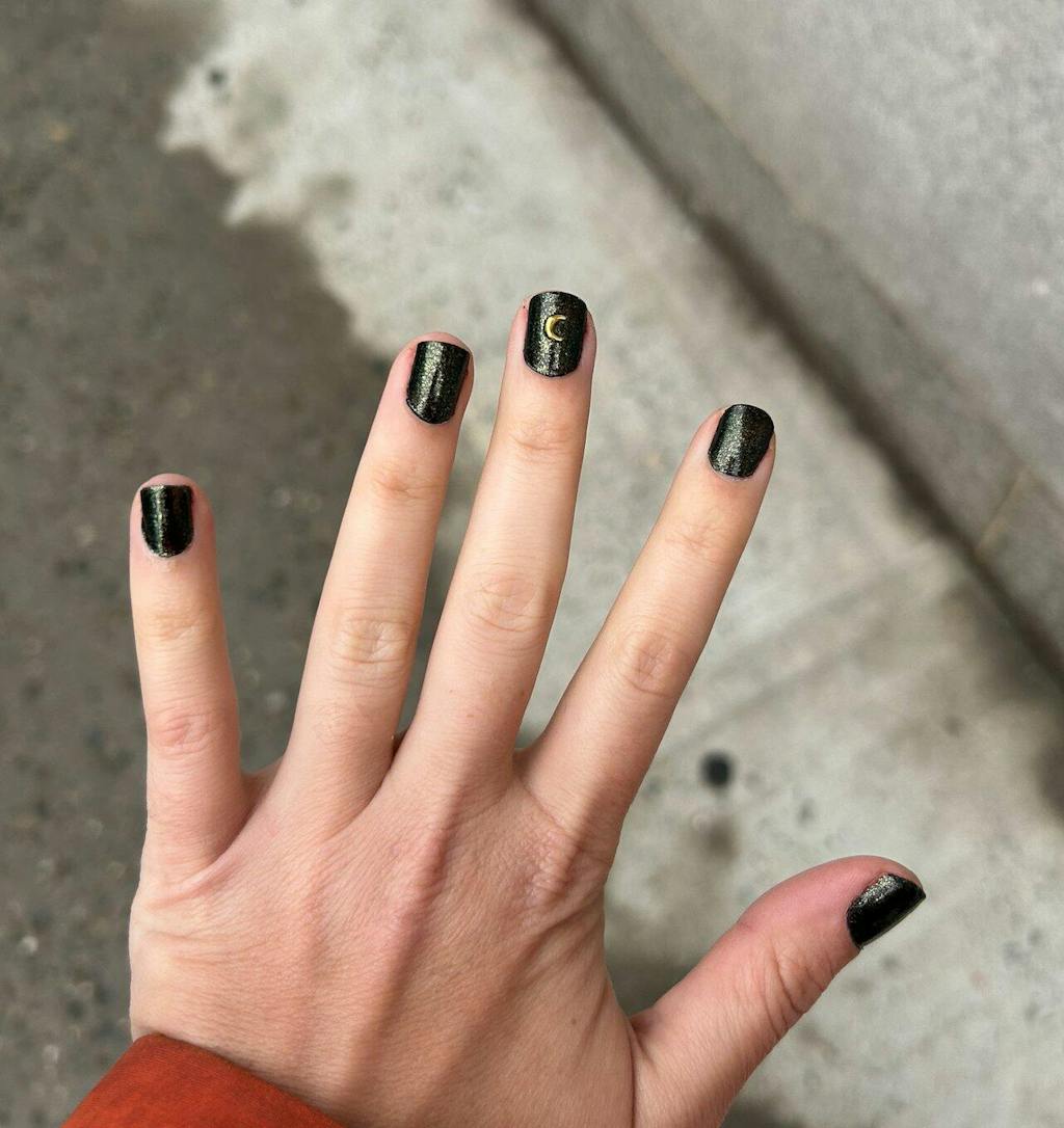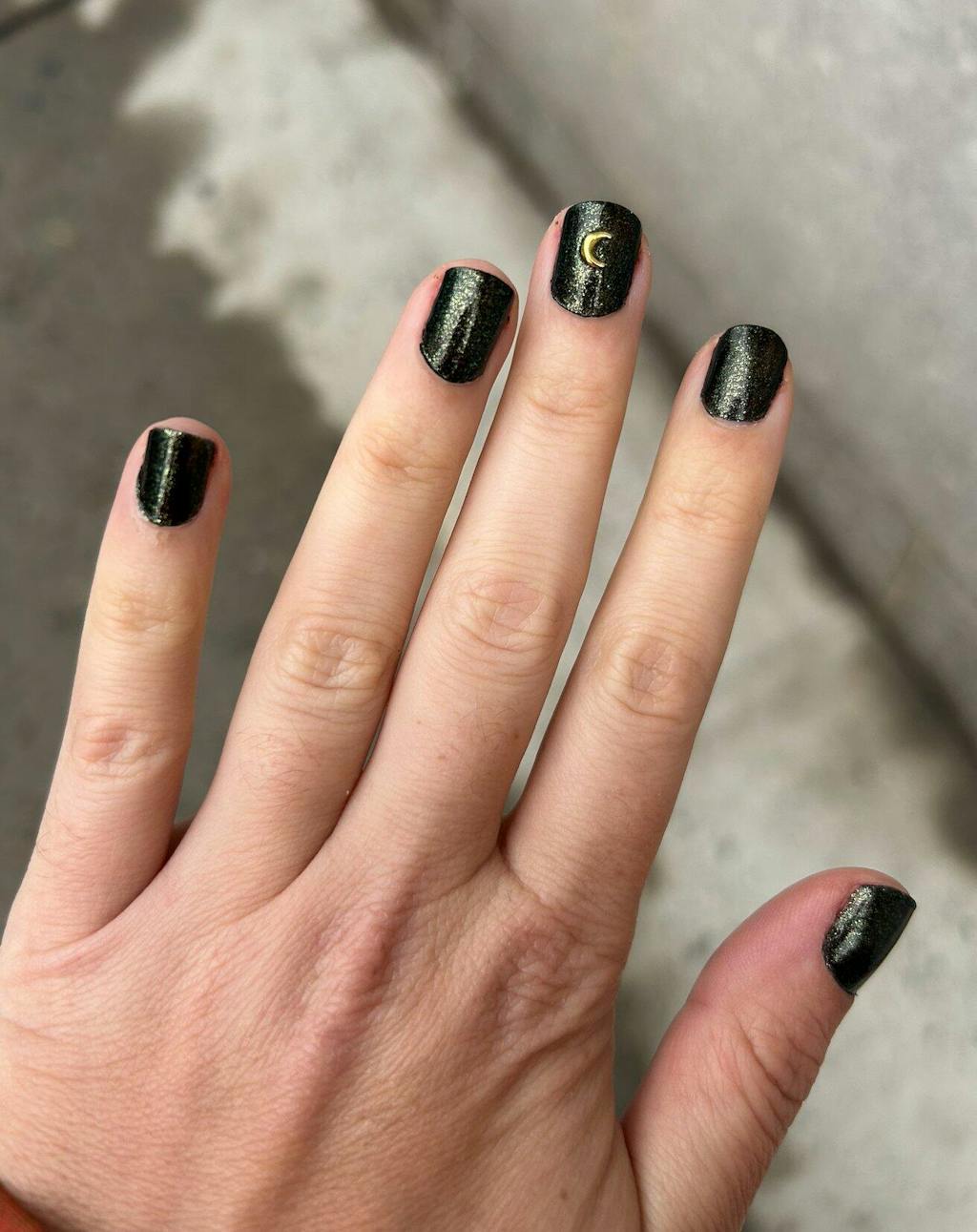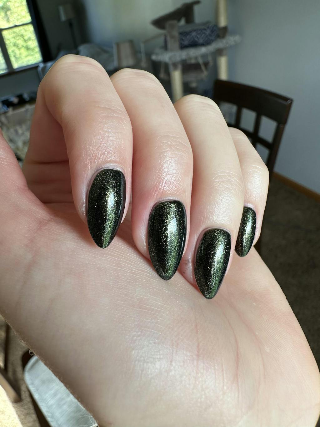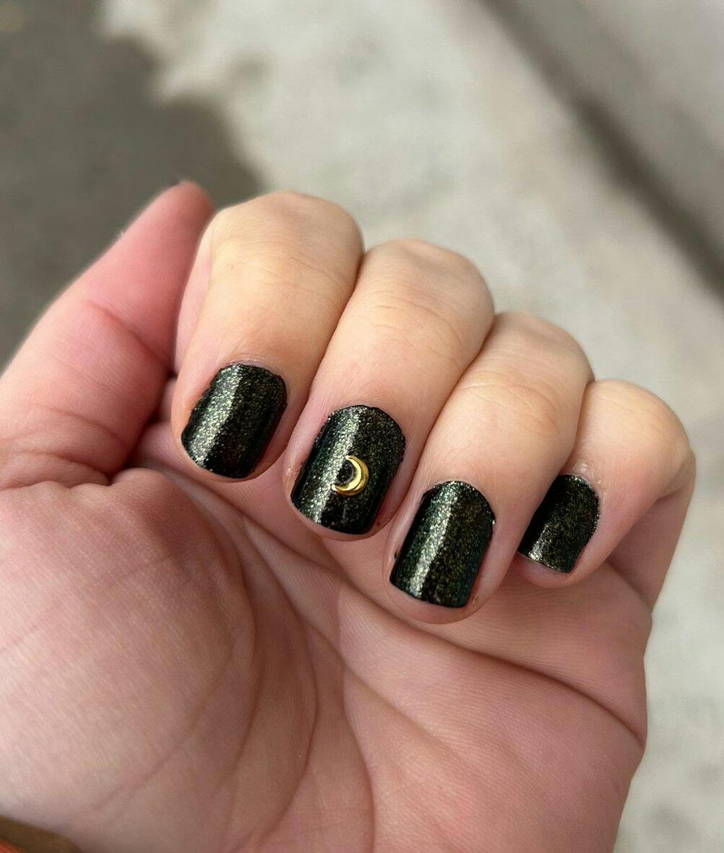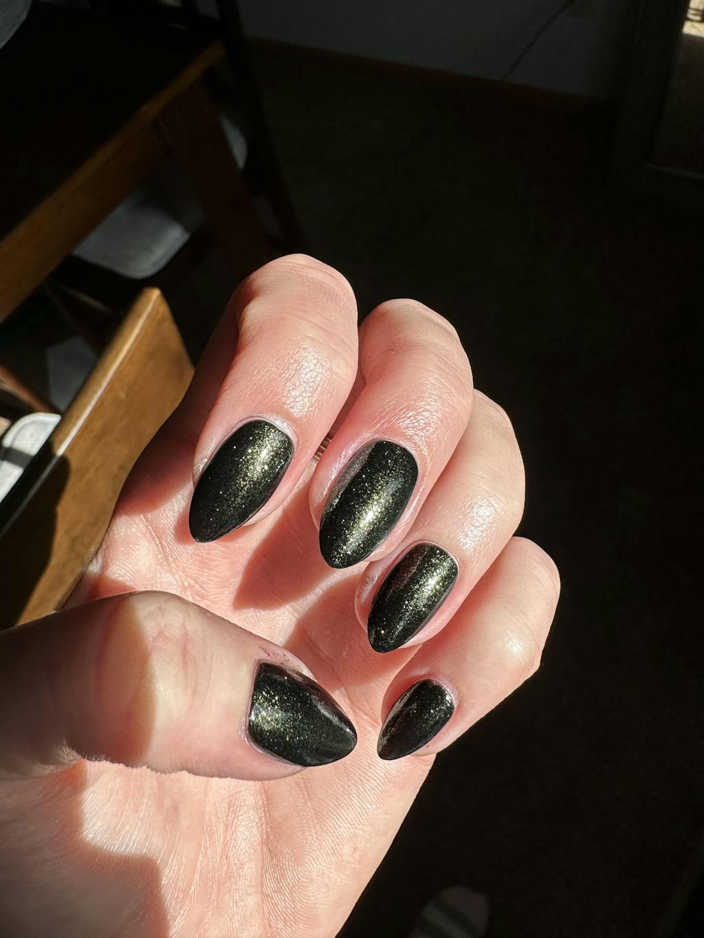 A black polish with a fine golden green shimmer finish.