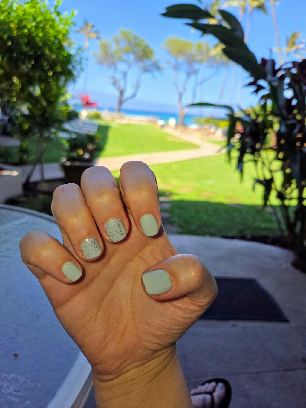 A pastel baby blue nail polish with a creme finish.