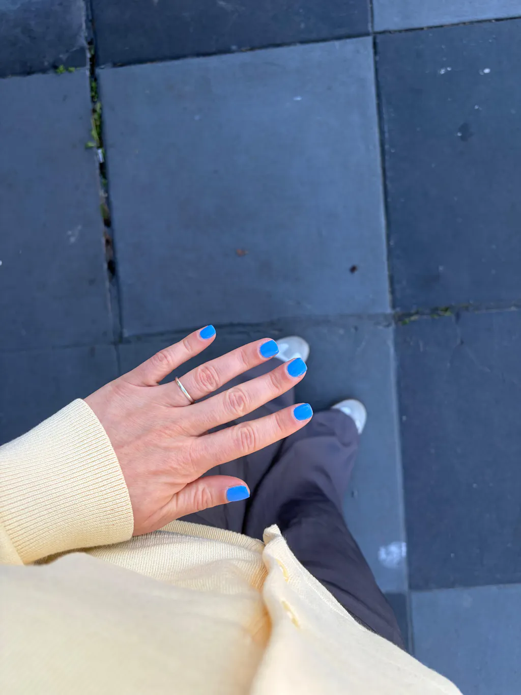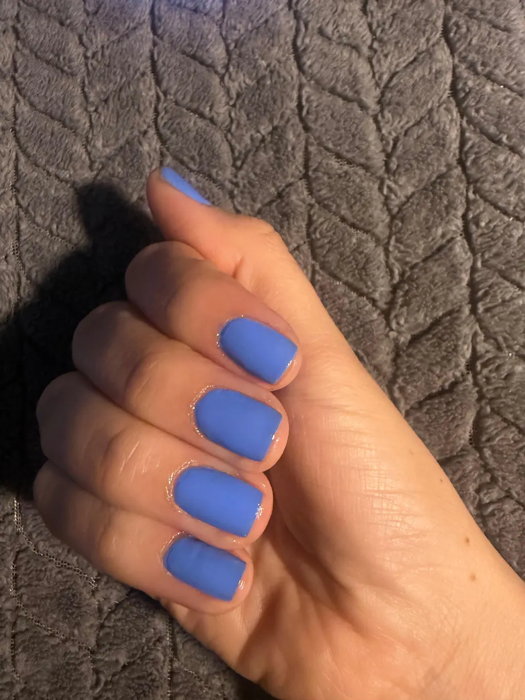 A bright cornflower blue nail polish with a creme finish.