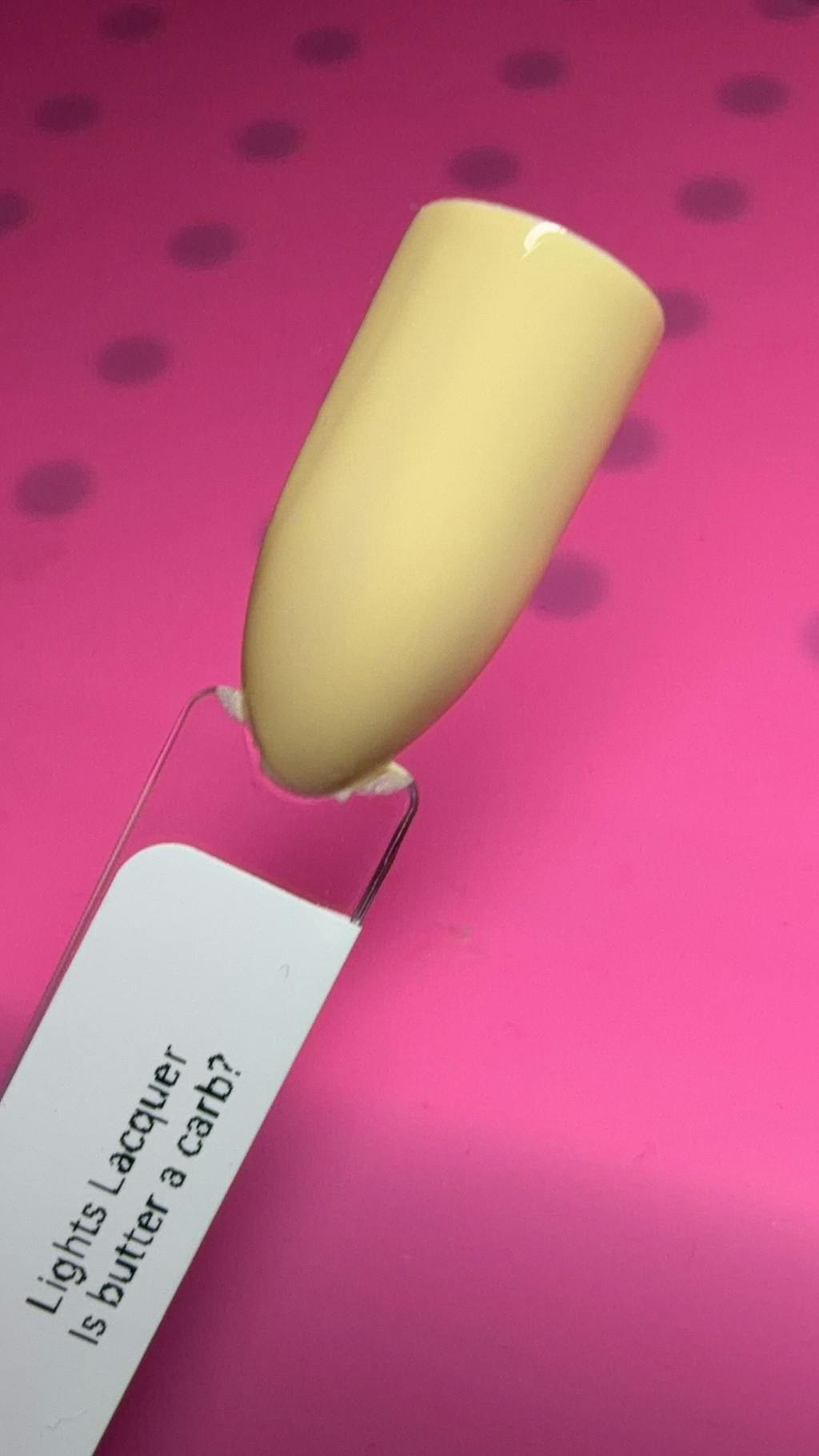 A pastel butter yellow nail polish with a creme finish.