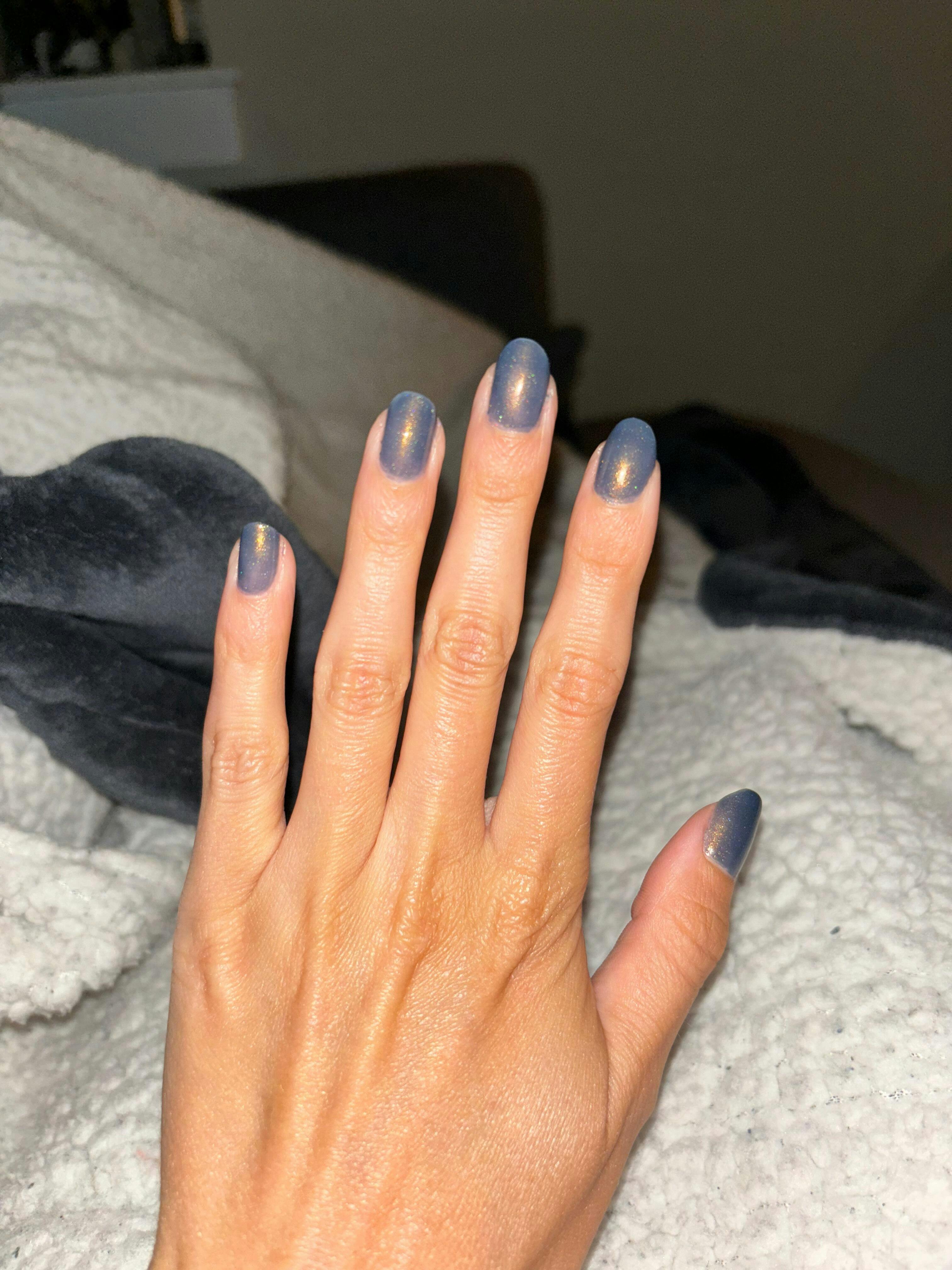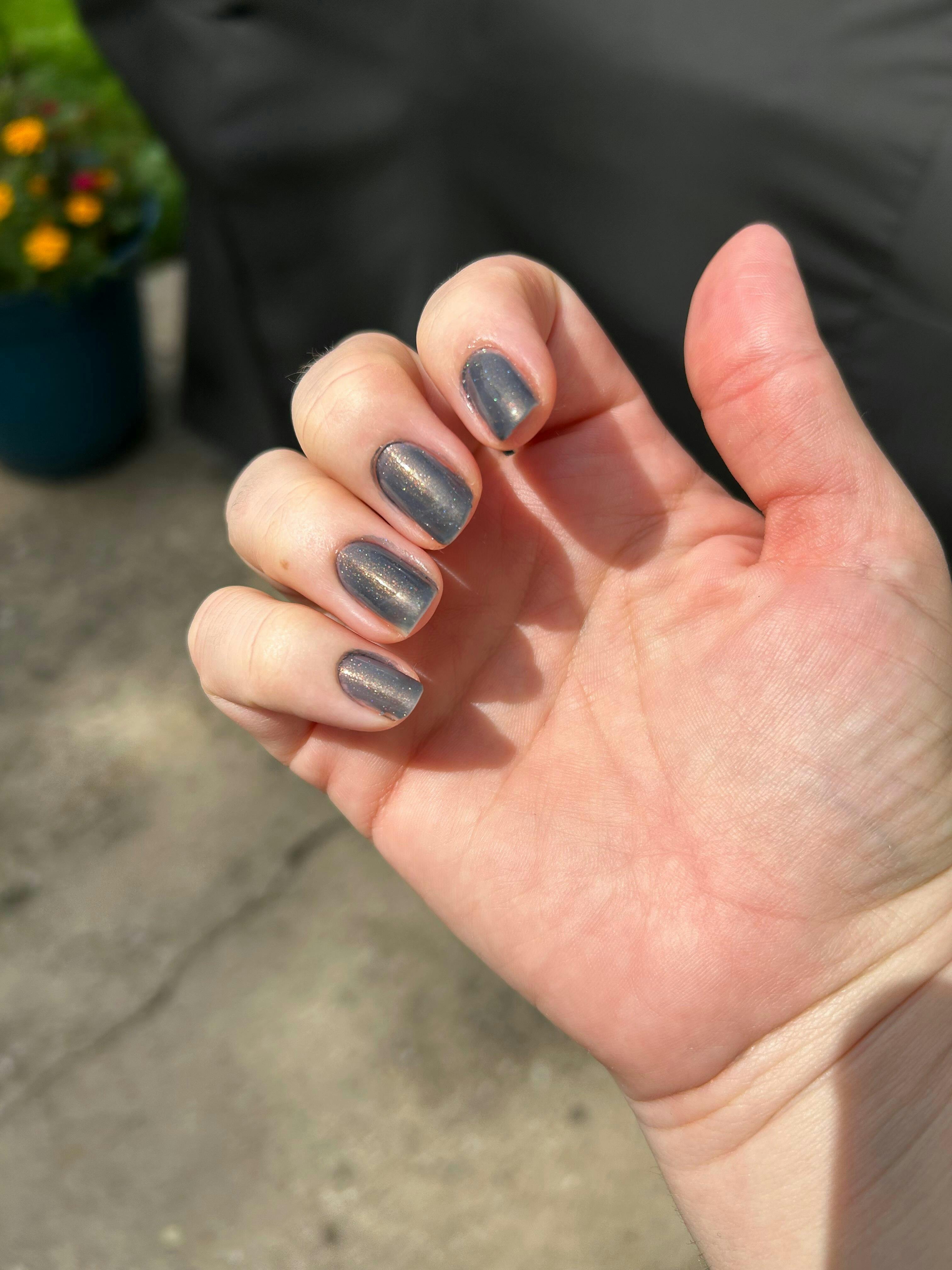 A charcoal blue sheer nail polish with fine holo glitter and a fine gold shimmer finish.