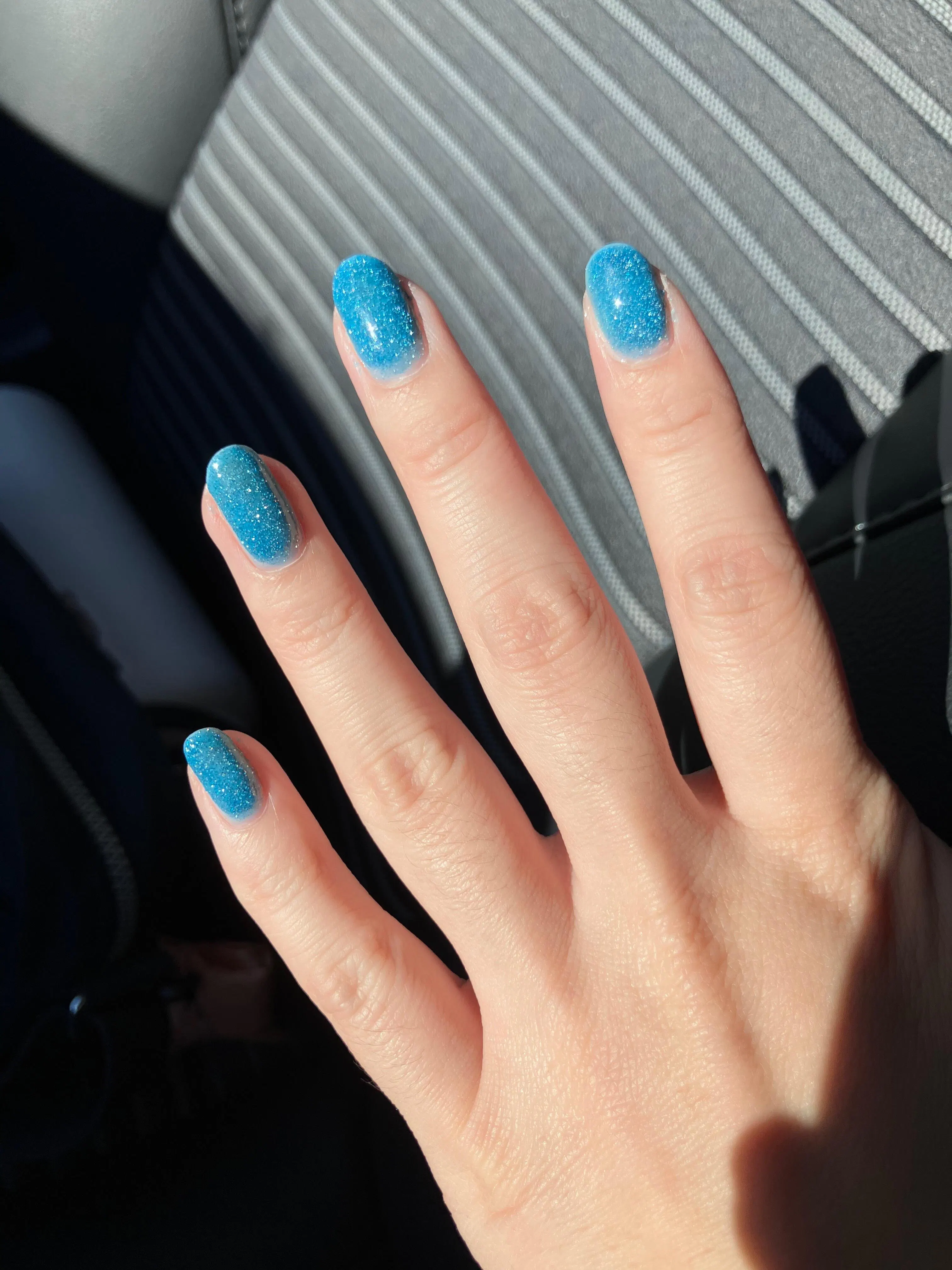 A deep ocean blue jelly polish with a reflective glitter finish.