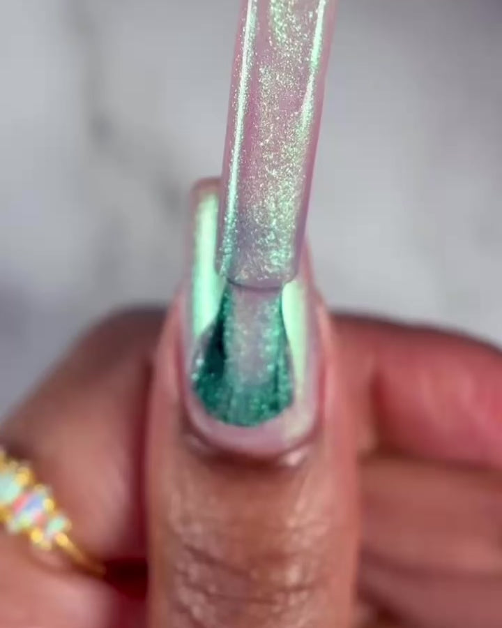 A lilac opalescent polish with a green shimmer finish.