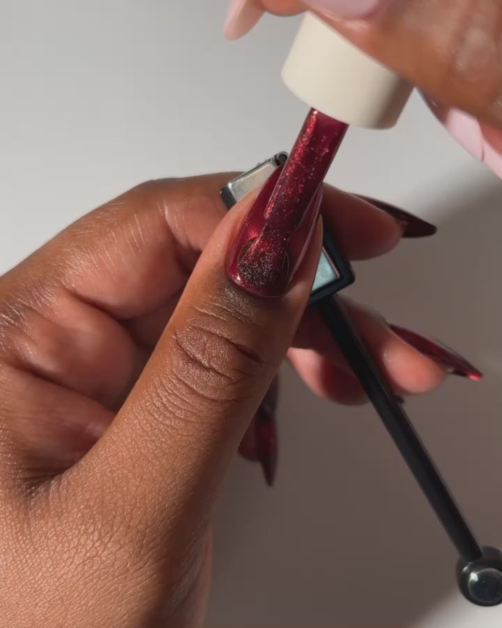 1. Apply your first coat of magnetic polish. While it’s still wet, hover the Magnetic Magic Wand close to the nail surface, moving it around your nail from every direction. Slightly turn the magnet as you go, and you’ll notice the pigment shifting.