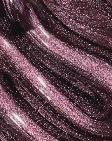 A deep burgundy shimmer nail polish with fine holo glitter, rose gold shimmer, and a magnetic finish.